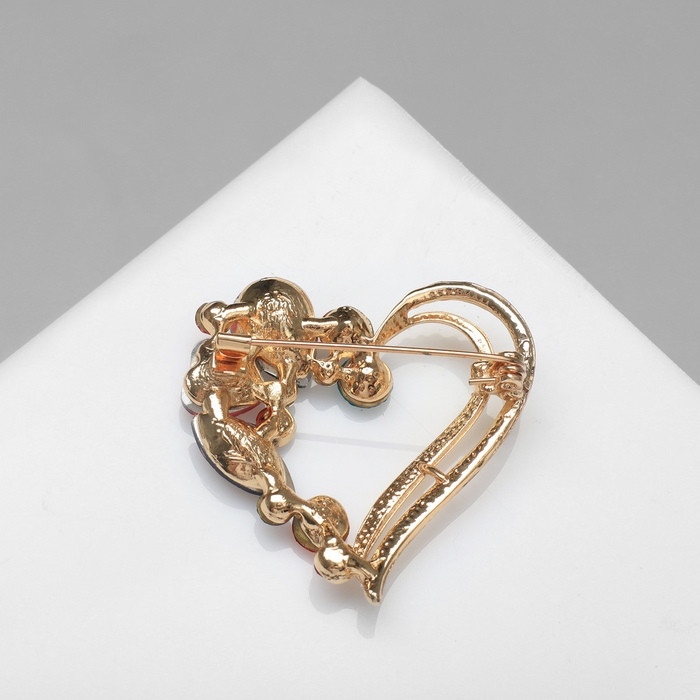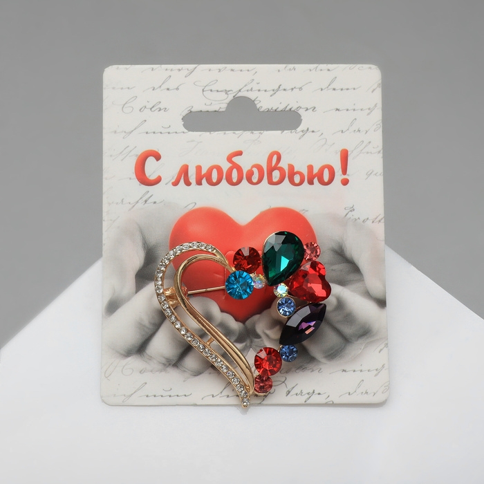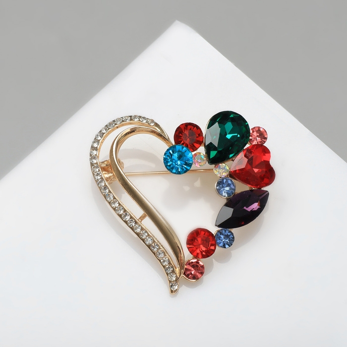 Брошь «Сердце» в камнях, цветная в золоте