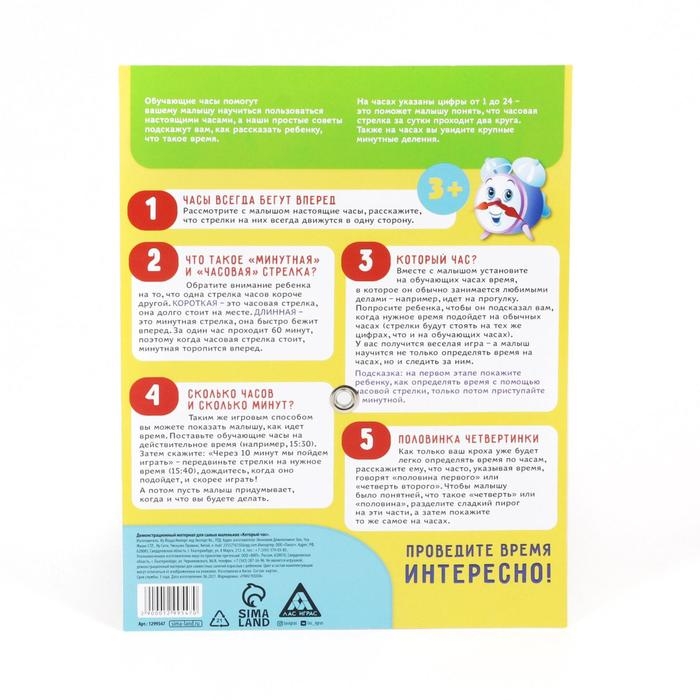 На обороте демонстрационного материала вас ждёт 5 заданий, которые помогут научиться ориентироваться по часам и закрепить полученные знания.