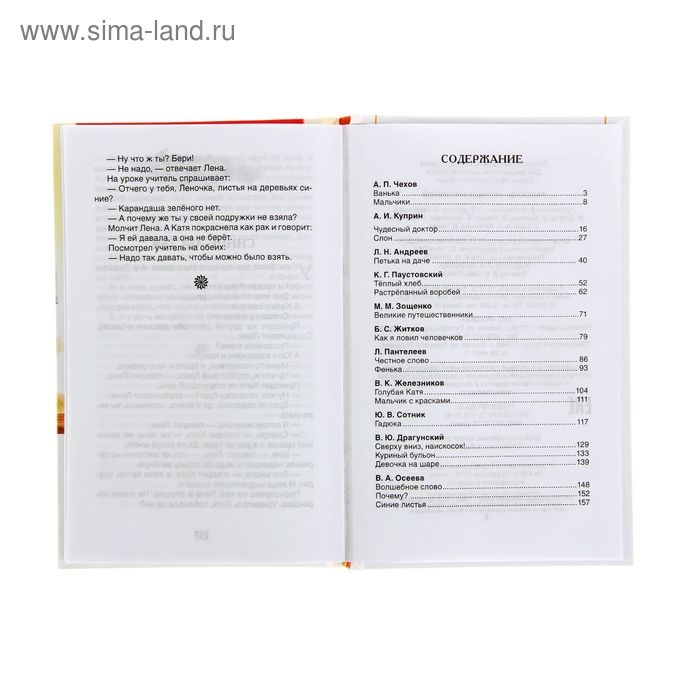 В книгу вошли произведения: А. Чехов «Ванька», «Мальчики», А. Куприн «Чудесный доктор», «Слон», Л. Андреев «Петька на даче», К. Паустовский «Теплый хлеб», «Растрепанный воробей», М. Зощенко «Великие путешественники», Б. Житков «Как я ловил человечков», Л. Пантелеев «Честное слово», «Фенька», В. Железников «Голубая Катя», «Мальчик с красками», Ю. Сотник «Гадюка», В. Драгунский «Сверху вниз, наискосок», «Куриный бульон», «Девочка на шаре», В. Осеева «Волшебное слово», «Почему?», «Синие листья».Художники: В. Челак, И. Панков, В. Коркин, В. Канивец и другие.