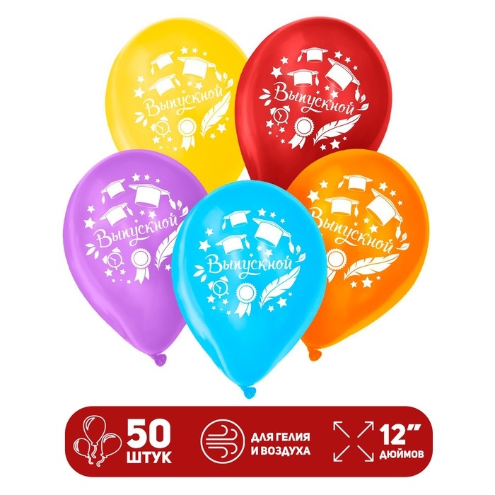 Каждый стремится сделать свой праздник ярким и неповторимым. Украсьте счастливые моменты, удивите гостей и близких! В этом вам поможет воздушный шар латексный 12", «Выпускной», 50 шт.. Аксессуары легко надуваются и поднимут настроение любой компании!