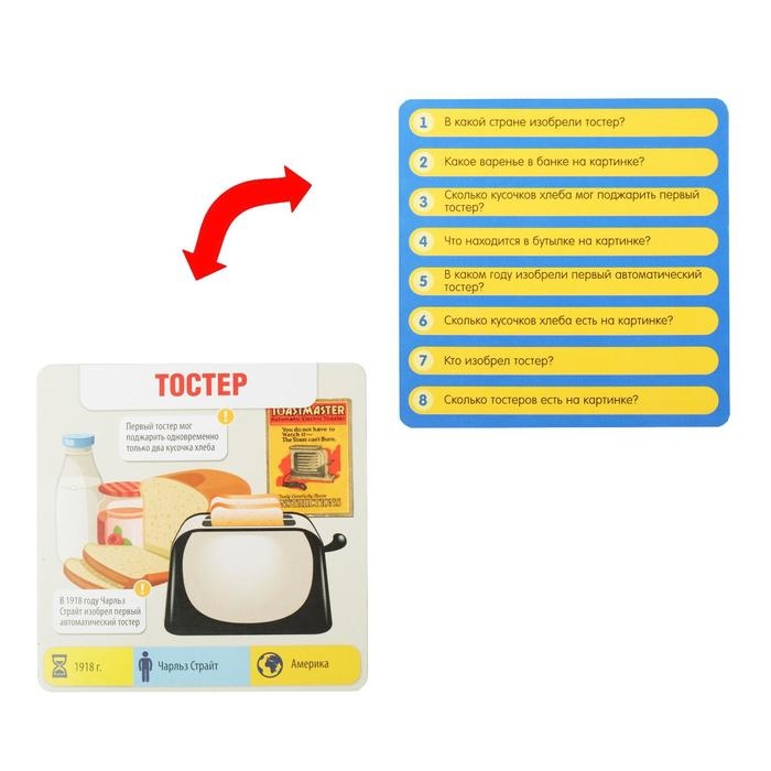 В наборе вы найдёте 50 карточек. На каждой из них нарисовано изобретение, а также указана краткая информация о нём: дата появления и некоторые интересные факты . Изучив карточку в течение 15 секунд, киньте кубик, а цифра вам укажет на номер задания. Все вопросы находятся на обороте карточек и относятся не только к цифрам и фактам, но ещё и к самому изображению. Тот игрок, кому удалось верно ответить на вопрос, забирает карточку себе, а побеждает самый внимательный участник, набравший больше всех карт!