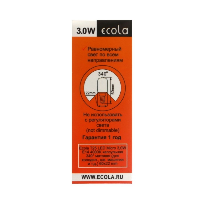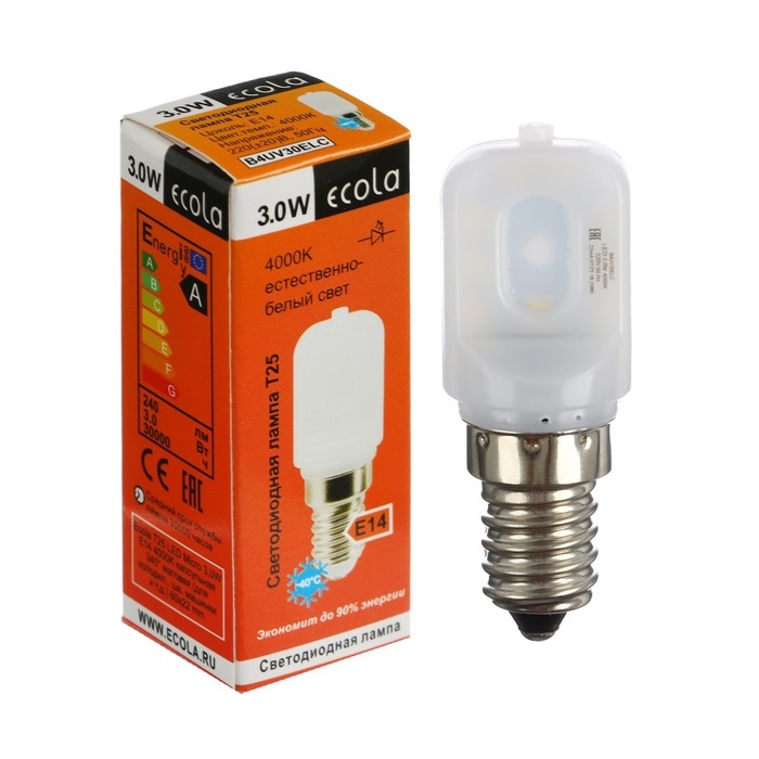 Лампа светодиодная Ecola, T25, E14, 3 Вт, 4000 K, 340°, для холодильников и швейных машин