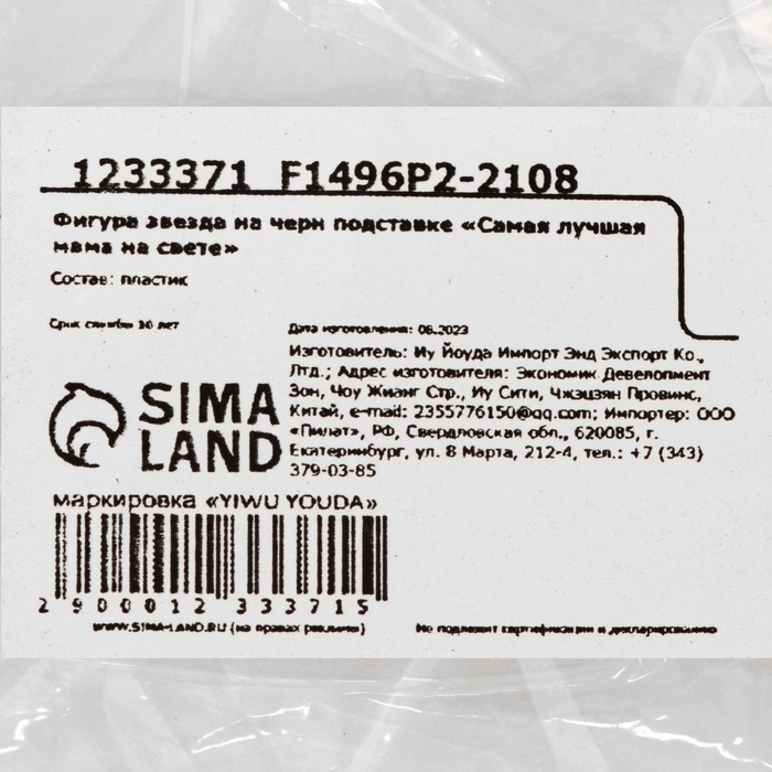 Наградная фигура выполнена из пластика и дополнена бумажным вкладышем с полноцветной печатью.