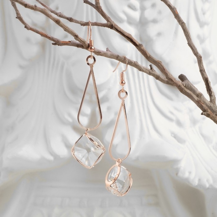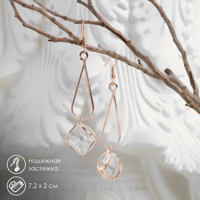 Серьги висячие со стразами «Капля с ромбом», цвет белый в розовом золоте, 7,2 см станут ярким дополнением вечернего наряда – длинного элегантного платья или однотонной блузки. Уберите волосы в высокий хвост или сделайте «шишечку», чтобы открыть линию плеч – украшение зрительно удлинит вашу шею, а черты лица сделает ещё изящнее и утончённее.