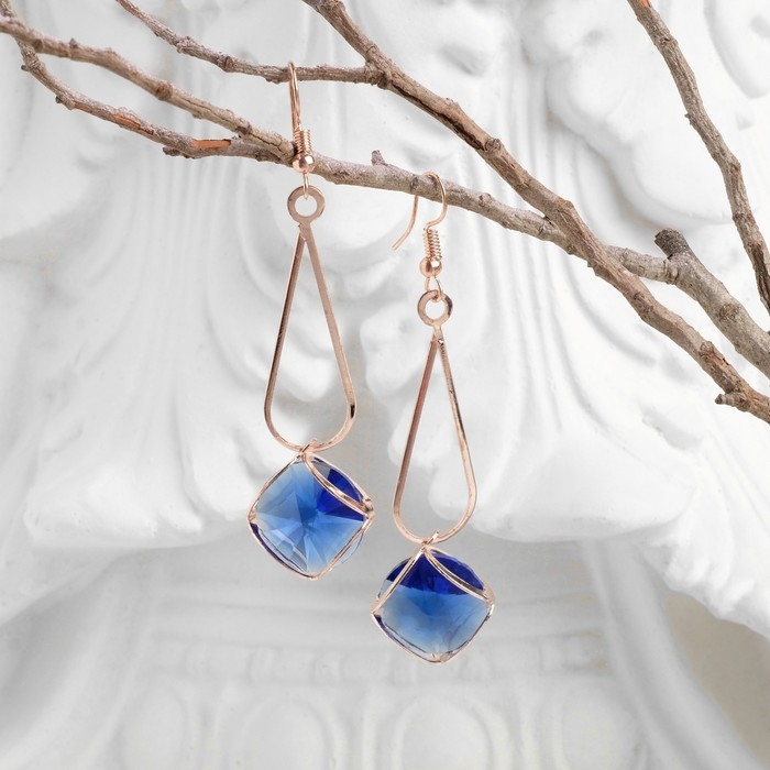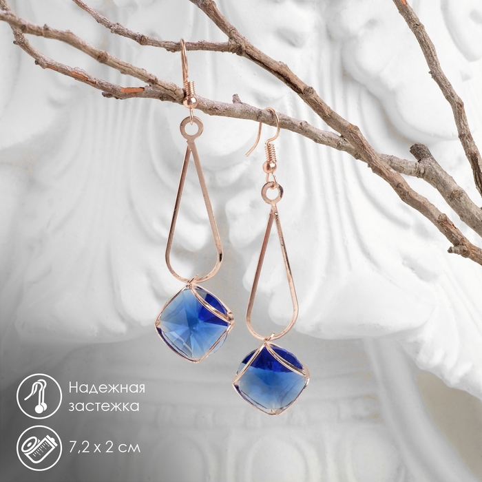 Серьги висячие со стразами «Капля с ромбом», цвет синий в розовом золоте