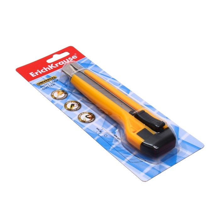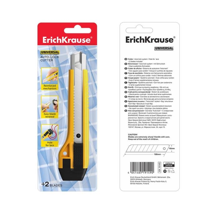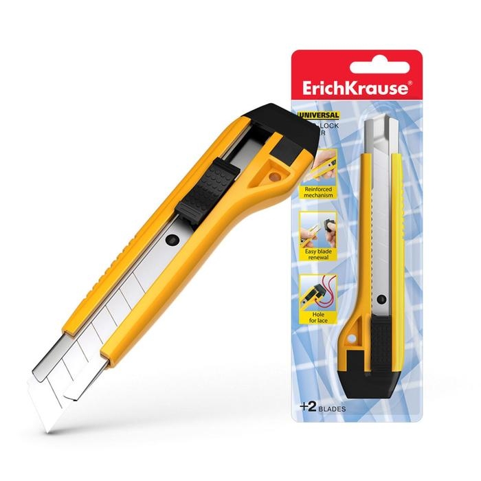 Нож канцелярский 18 мм, Erich Krause Universal, с автоматической системой фиксации лезвия auto-lock и насадкой для безопасного отделения сегмента лезвия, металлические направляющие, 2 лезвия в наборе, блистер