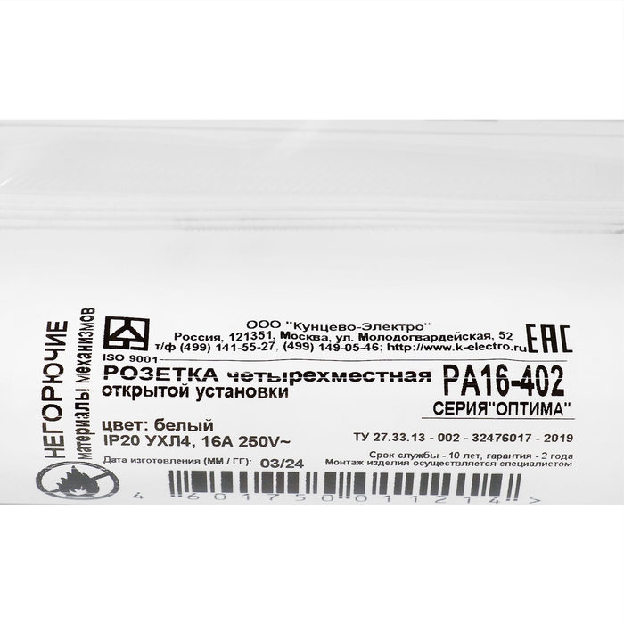 Розетка "Кунцево" Оптима, четырехместная, 16 А, 250 В, без з/к, наружная, белая