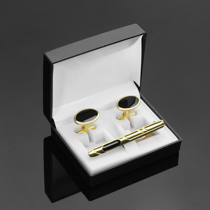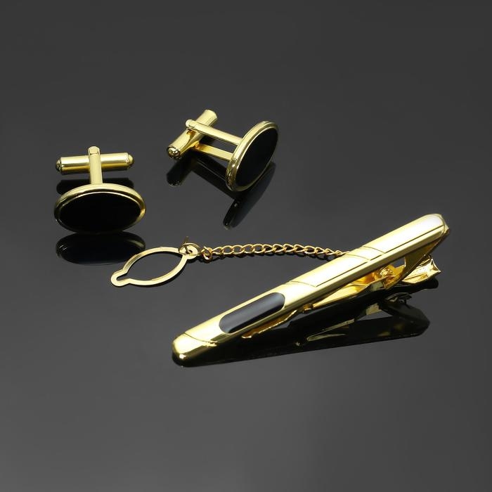 Набор мужской медный «Запонки + Зажим (6 см) для галстука» овал с эмалью, цвет чёрный в золоте