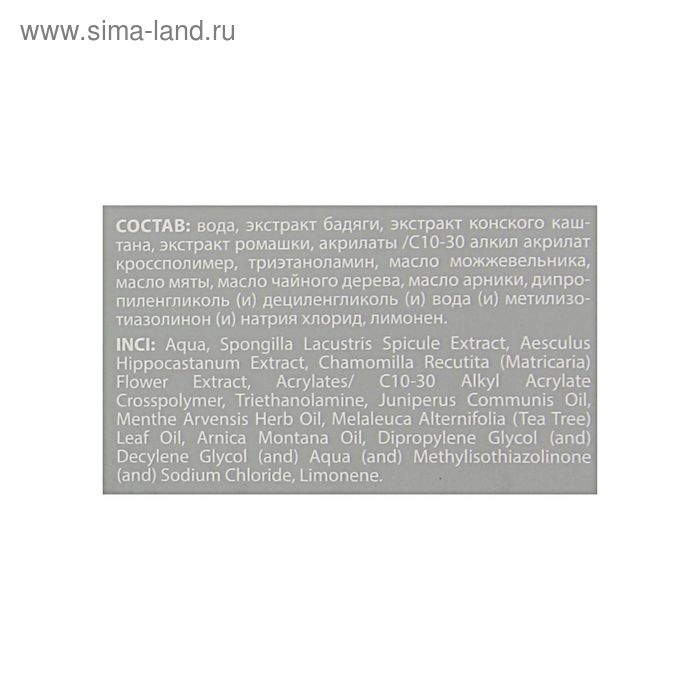 Оно обладает антисептическим и успокаивающим действием. Содержит экстракты ромашки и конского каштана, эфирные масла чайного дерева, можжевельника, мяты и арники. Всё это помогает укрепить стенки кровеносных сосудов и капилляров, уменьшить отёки и способствует рассасыванию гематом.