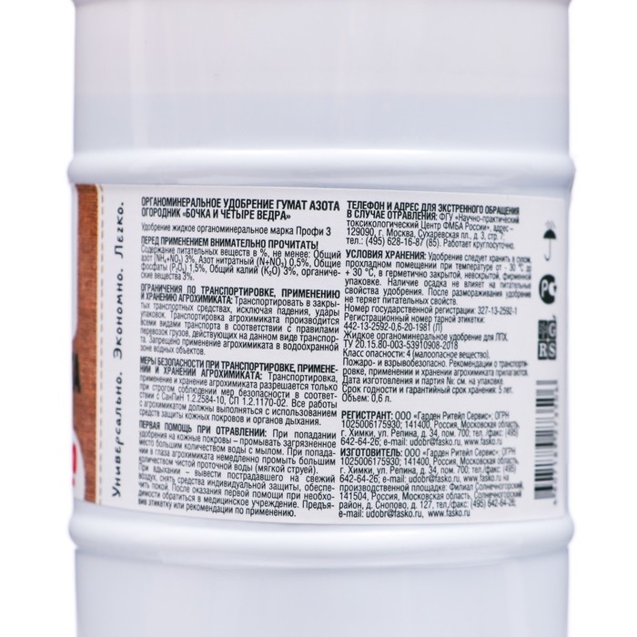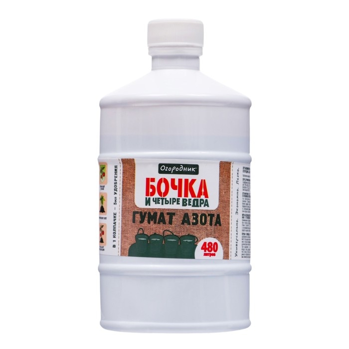 Гумат азота «Бочка и четыре ведра» — органическое удобрение, предназначенное для подкормки овощных, плодовых, ягодных и декоративно-цветочных культур.