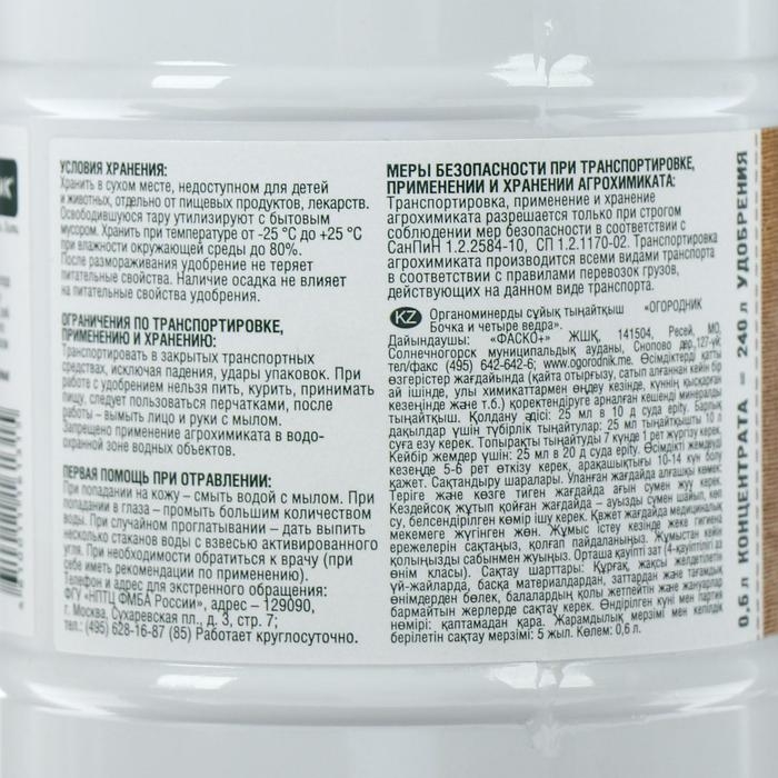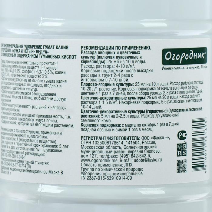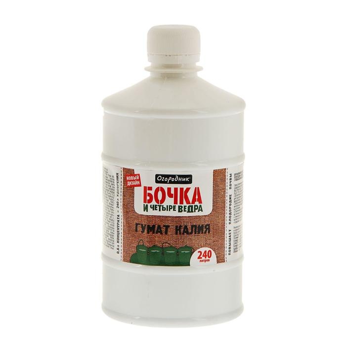 Удобрение органическое жидкое Бочка и четыре ведра, гумат калия в бутылках, 600 мл