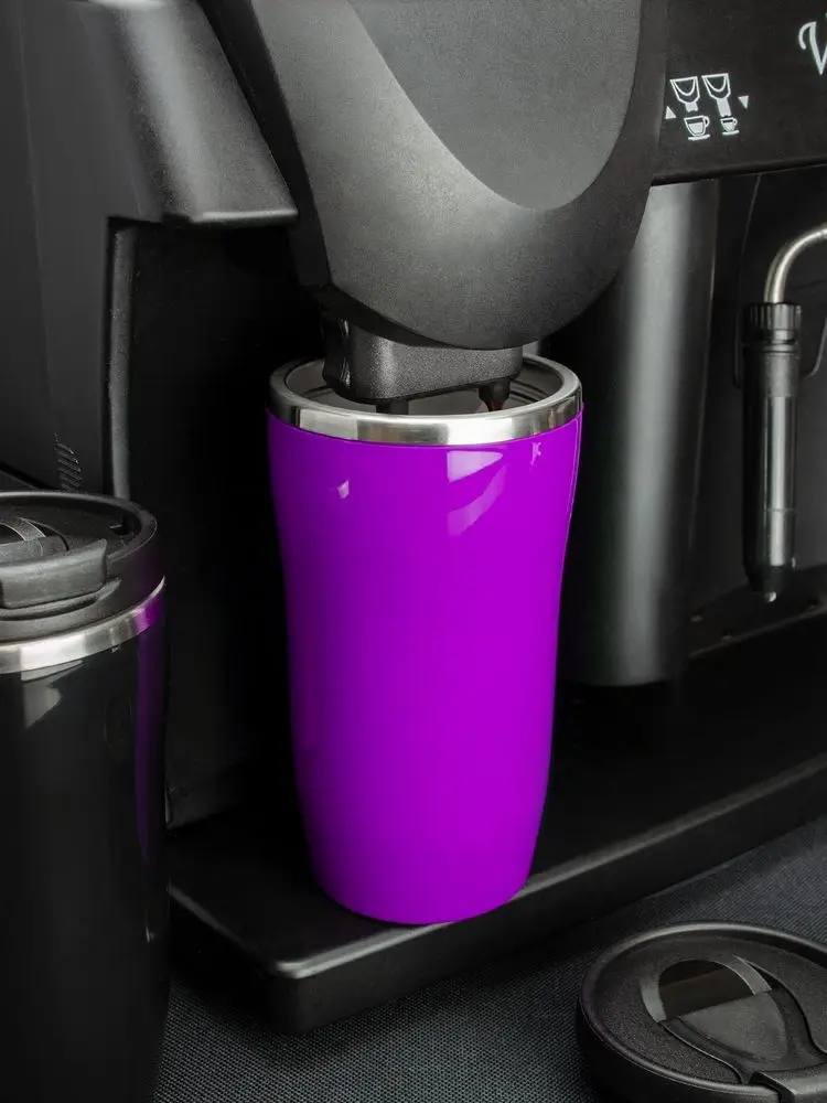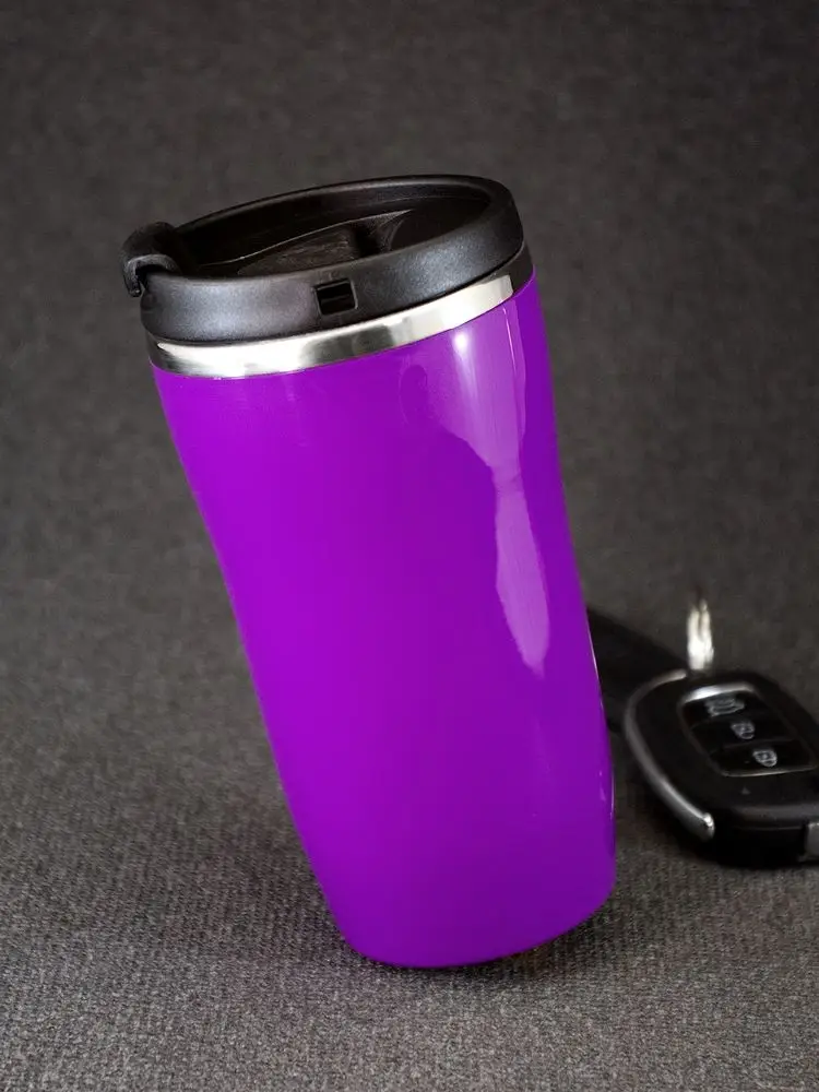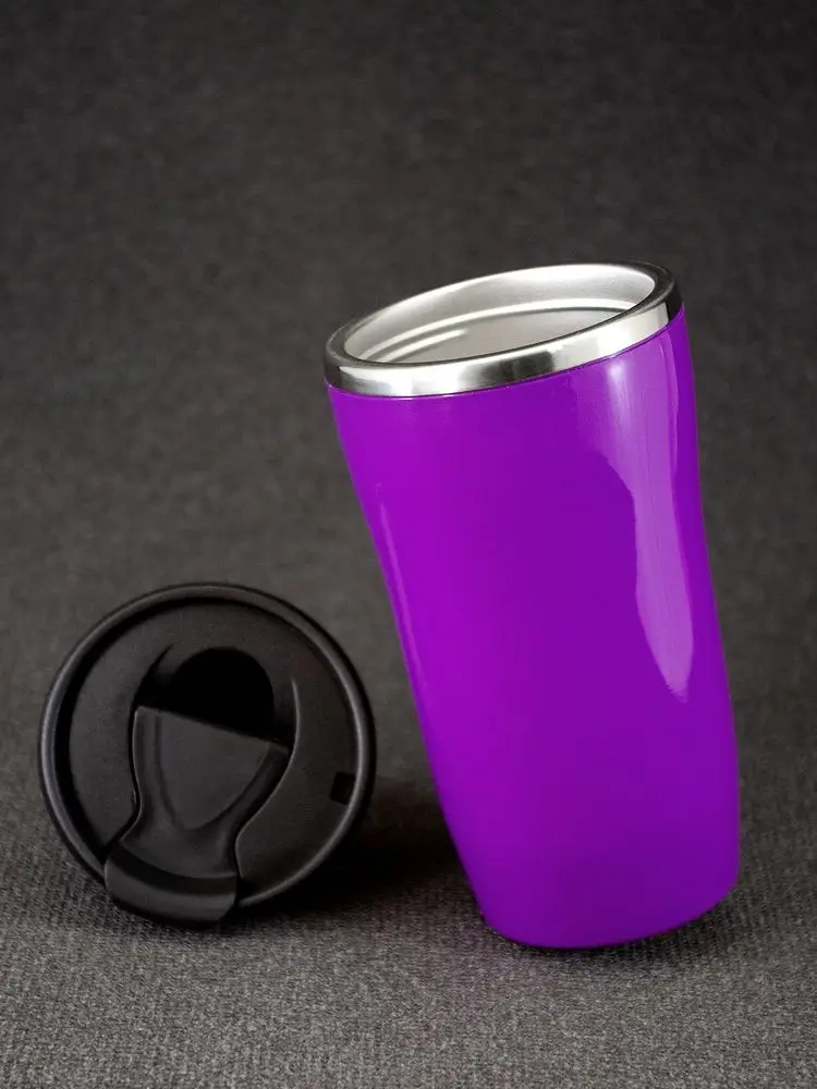Двухслойная конструкция из пластика снаружи и пищевой нержавеющей стали внутри. Герметичная завинчивающаяся крышка с откидным клапаном для питья. В отверстие в крышке можно вставить шнурок для удобного ношения стакана на руке. Шнурок в комплект не входит.