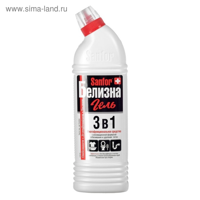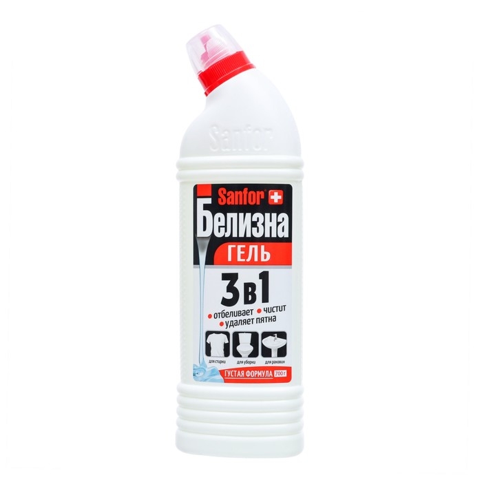 Sanfor «Белизна-гель» 3 в 1 — многофункциональное густое средство с инновационной формулой отбеливания и удаления пятен. Подходит для стирки, а также для дезинфекции и чистки сантехники и труб.