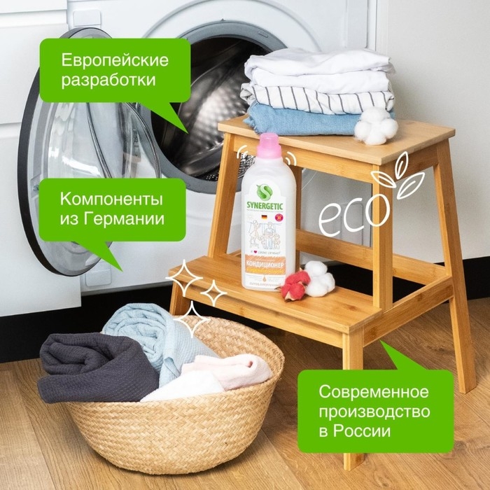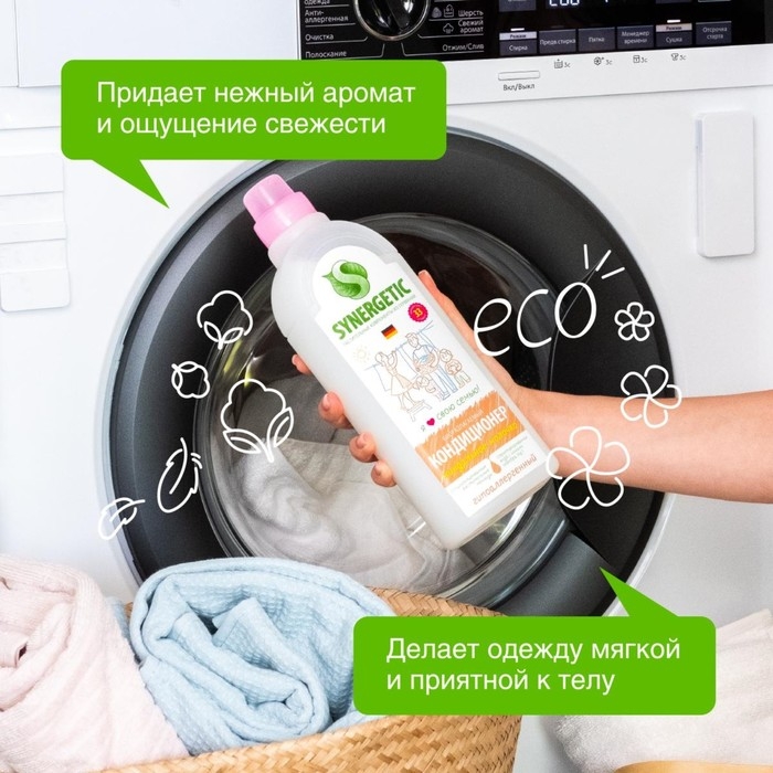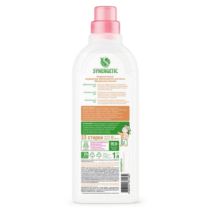 Биоразлагаемый кондиционер-ополаскиватель для белья SYNERGETIC "Миндальное молочко" – высокоэффективное средство, бережно ухаживающее за всеми типами ткани, в том числе деликатными, и придающее особую мягкость и нежность белью после стирки.