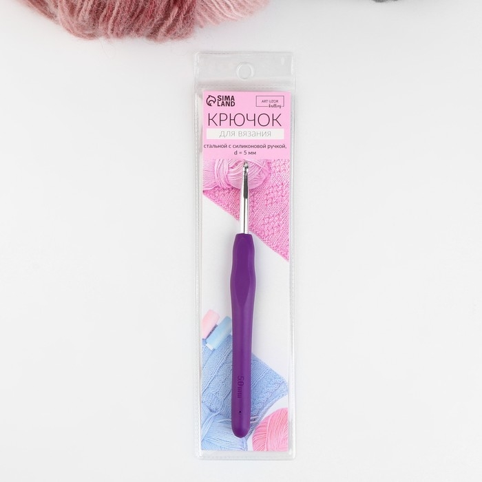 Крючок для вязания, с силиконовой ручкой, d = 5 мм, 14 см, цвет фиолетовый