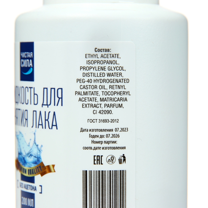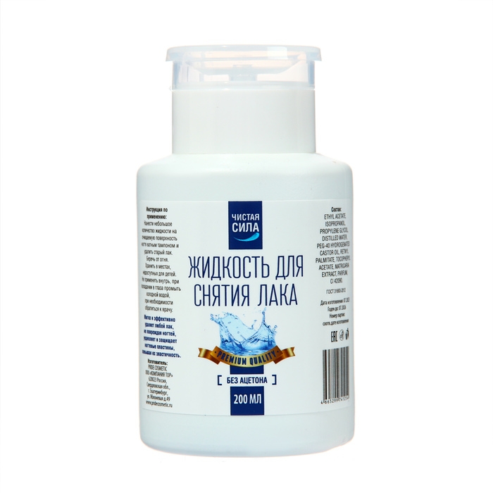 Жидкость для снятия лака "Чистая сила быстро и мягко удаляет все виды лаков, укрепляет, защищает и делает эластичной ногтевую пластину. Имеет легкий приятный аромат. Не содержит ацетона.