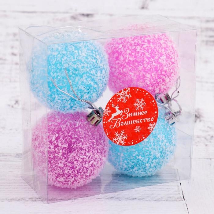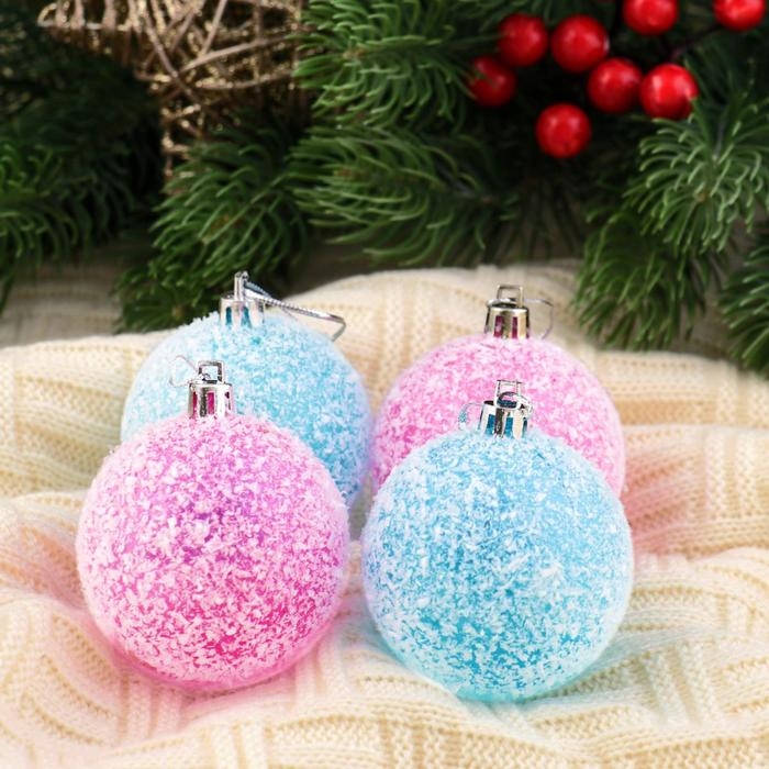 Набор шаров пластик d-6 см, 4 шт "Заснеженный" малиновый голубой