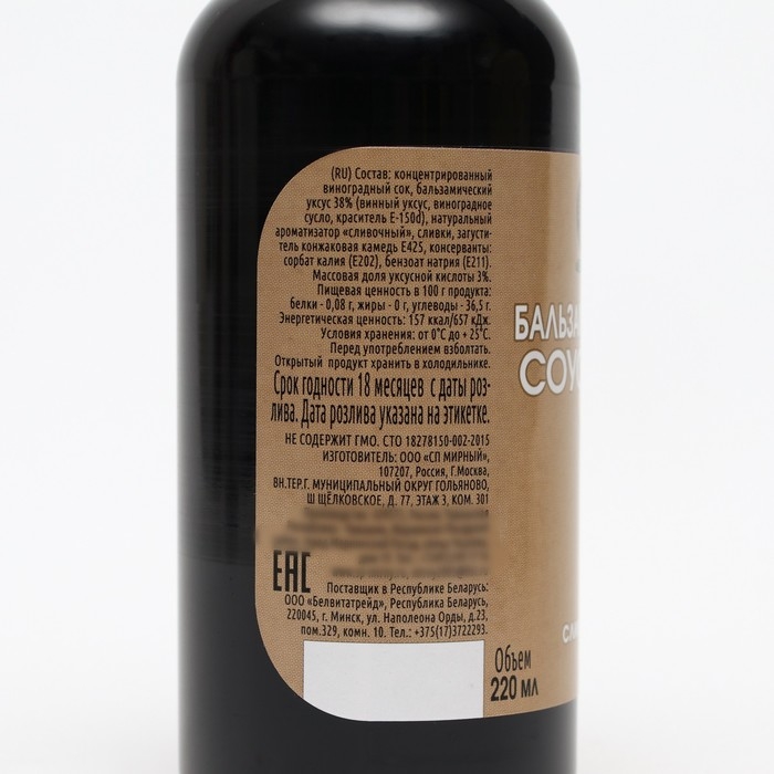 Состав: концентрированный виноградный сок, бальзамический уксус 38 % (винный уксус, виноградное сусло, краситель Е-150d) натуральный ароматизатор «Сливочный», сливки, загуститель конжаковая камедь Е425. Массовая доля уксусной кислоты 3 %. Не содержит консервантов.