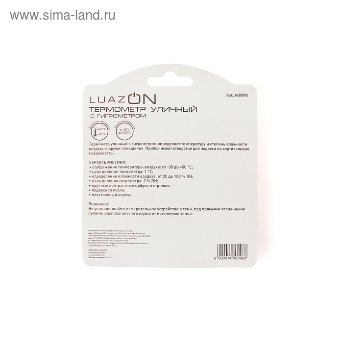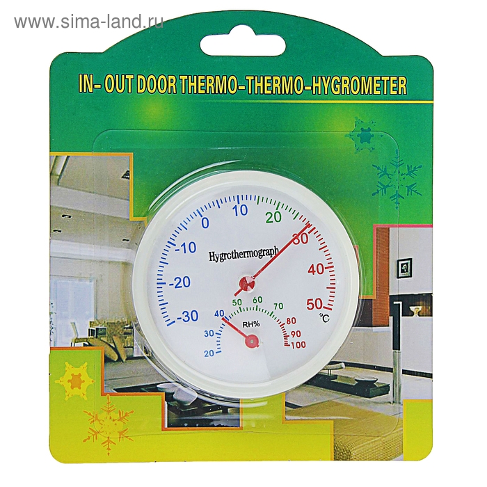 Термометр предназначен для использования в быту. Его основные функции: определение температуры и влажности воздуха снаружи и внутри помещения. На обратной стороне прибора предусмотрено отверстие для подвеса.