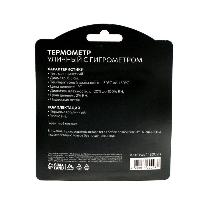 Термометр уличный, гигрометр, d=6.5 cм, белый