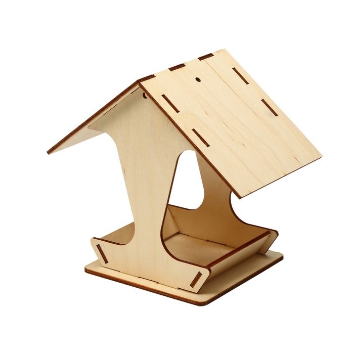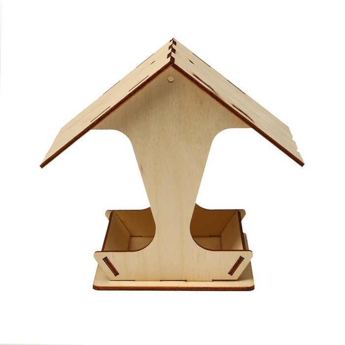 Чтобы собрать кормушку, аккуратно соедините фанерные детали, вставляя их в пазы. Используйте клей для лучшей фиксации. При желании модель можно раскрасить или задекорировать.