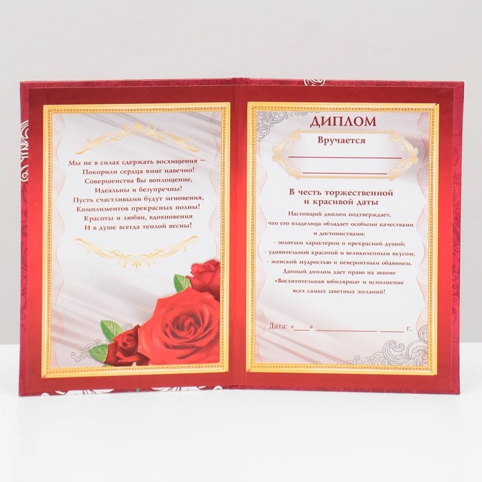 На любом торжестве есть место как серьёзным и официальным поздравлениям, так и весёлым шуткам! Традиционный формат, интересная обложка и позитивное содержание этого диплома украсят ваше мероприятие и позволят посмеяться от души.