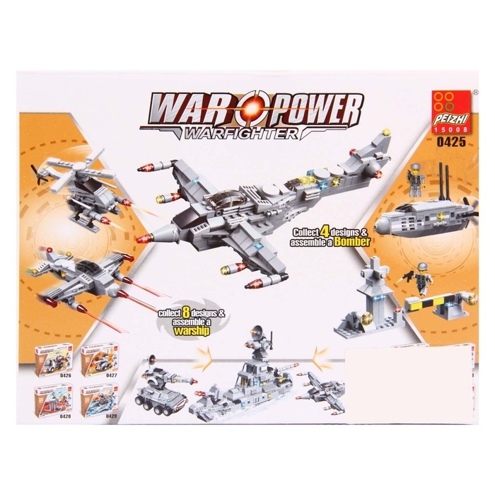 Игровой набор содержит 95 деталей и позволяет сконструировать три варианта техники: стационарный пулемёт, истребитель, вертолёт.