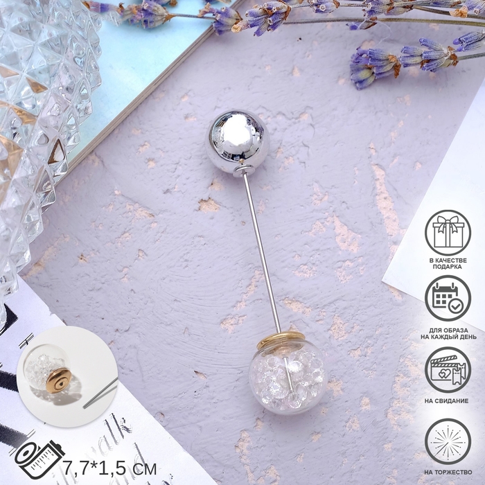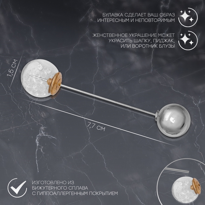 Данная булавка – настоящая находка для модниц, предпочитающих нетривиальные аксессуары. Брошь-булавка станет не только оригинальным дополнением вашего наряда, но и позволит без труда приколоть при необходимости палантин или шейный платок. Используйте её в качестве украшения шляпки, рубашки или галстука. Булавка «Волшебный шар», 7,7 см, цвет белый в серебре внесёт особую нотку изящности в ваш образ.