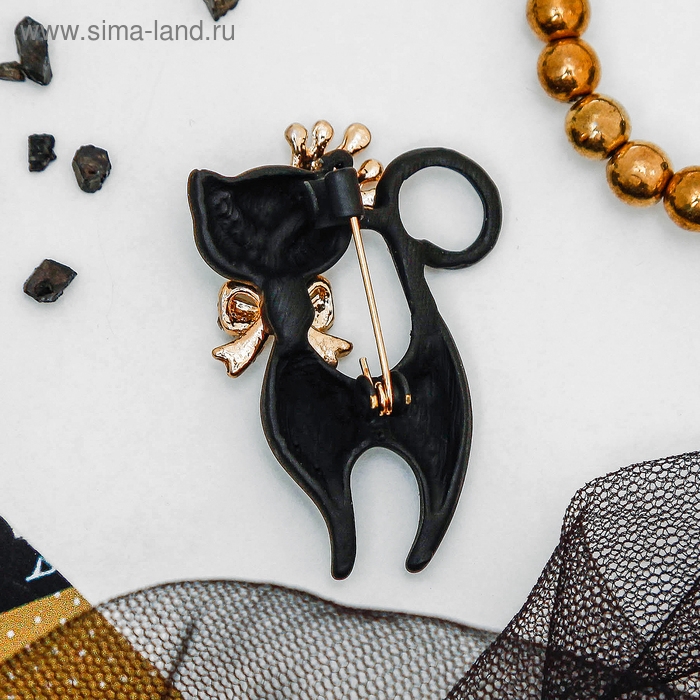 Брошь «Кошка грация», в короне, цвет матовый чёрный в золоте