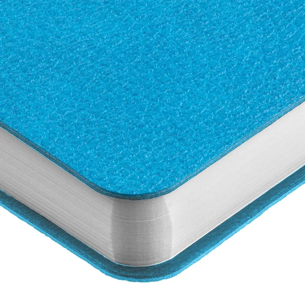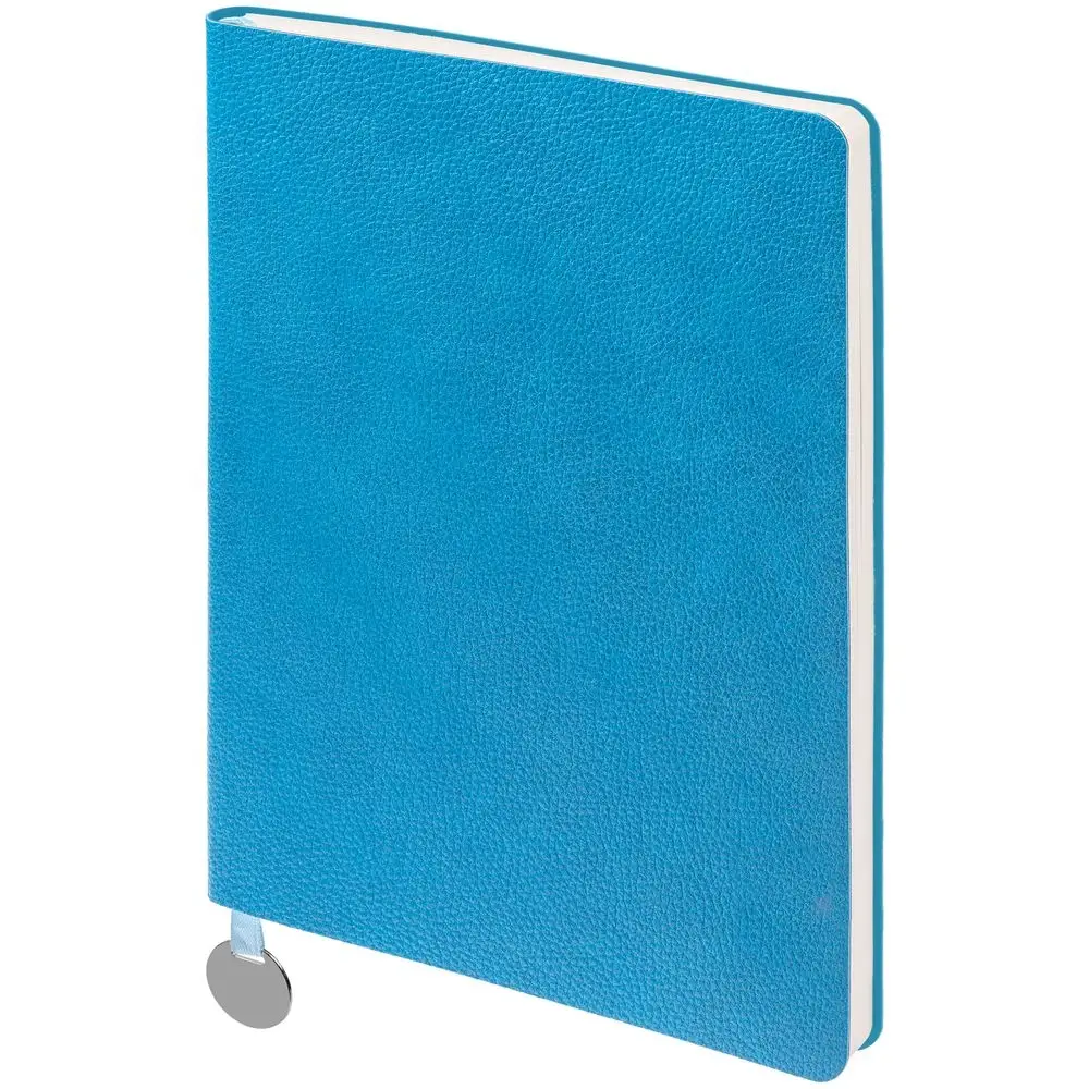 Ежедневник с гибкой обложкой, выполнен из материал La Fite, голубой JJ, дополнен ляссе в цвет обложки с металлическим шильдом.