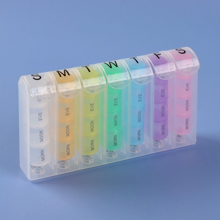 Таблетница-органайзер «Неделька», английские буквы, утро/день/вечер/ночь, 10 × 7,5 × 4 см, 7 контейнеров по 4 секции, разноцветный