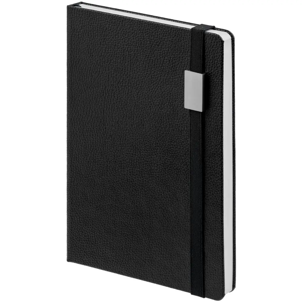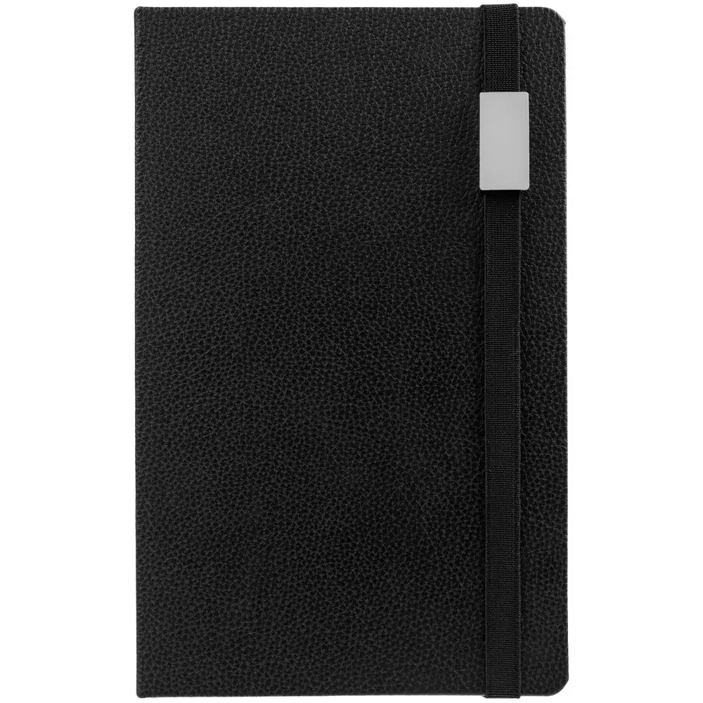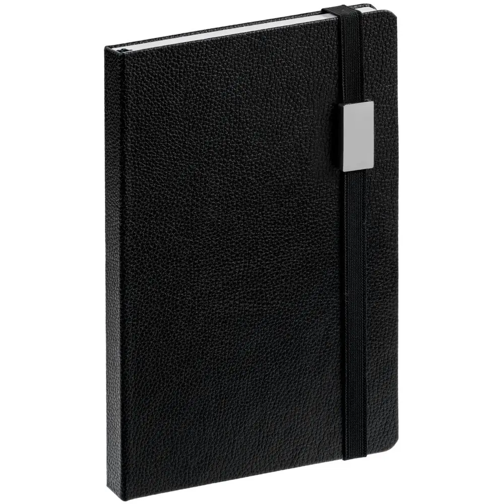 Зауженный ежедневник с прямоугольным металлическим шильдом на резинке.