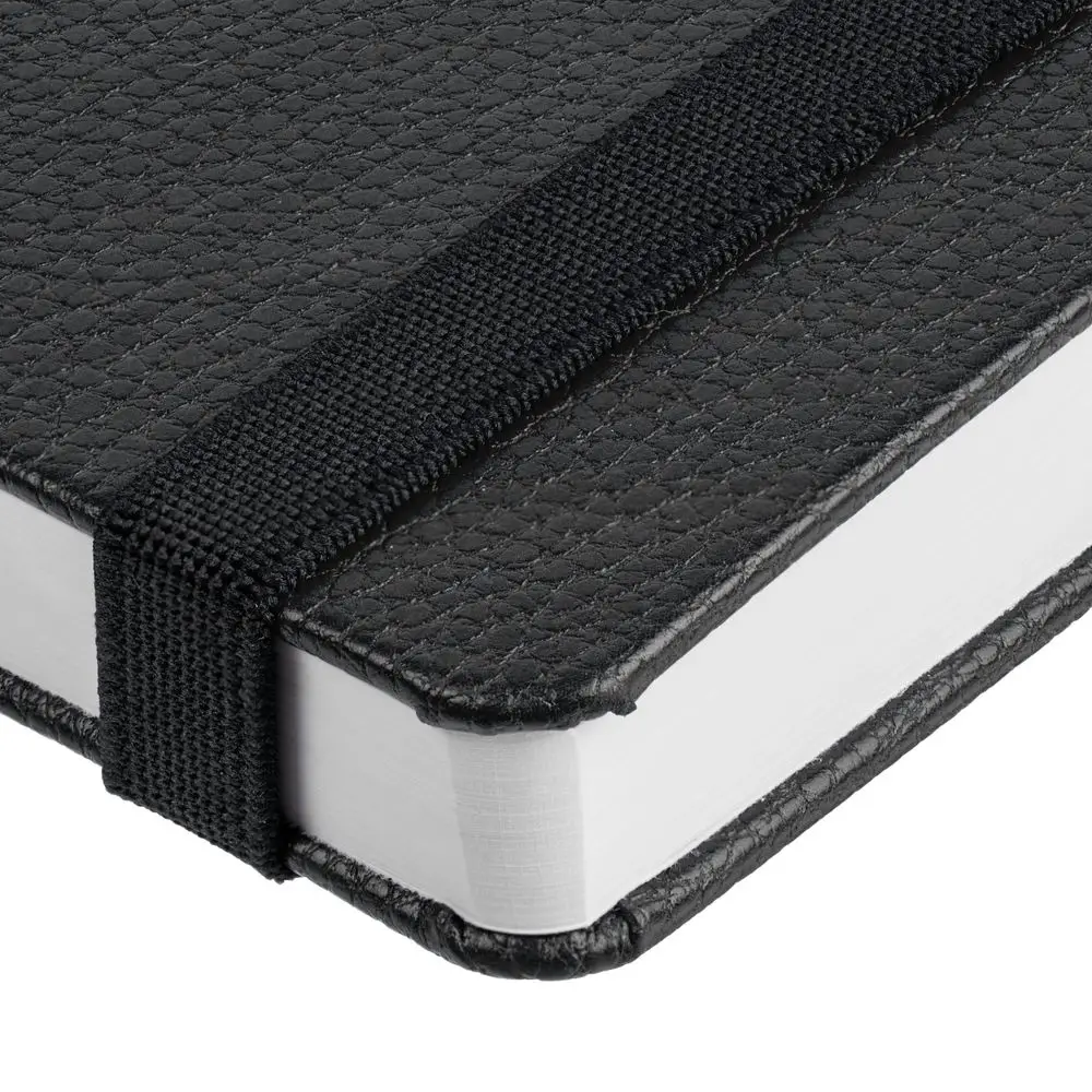 Зауженный ежедневник с круглым металлическим шильдом на резинке.