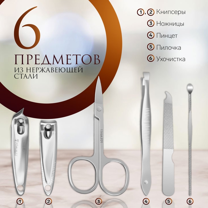 Книпсер, Ножницы, Пилка, Пинцет, Ухочистка