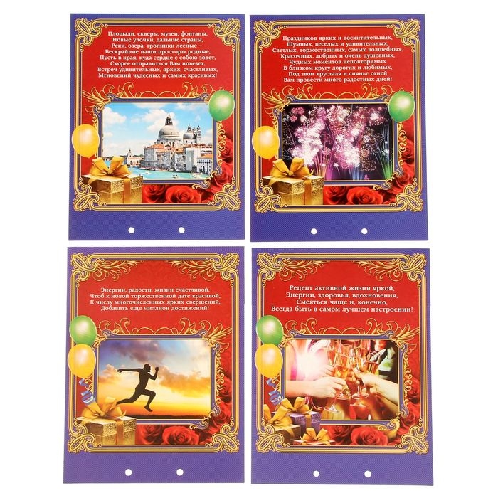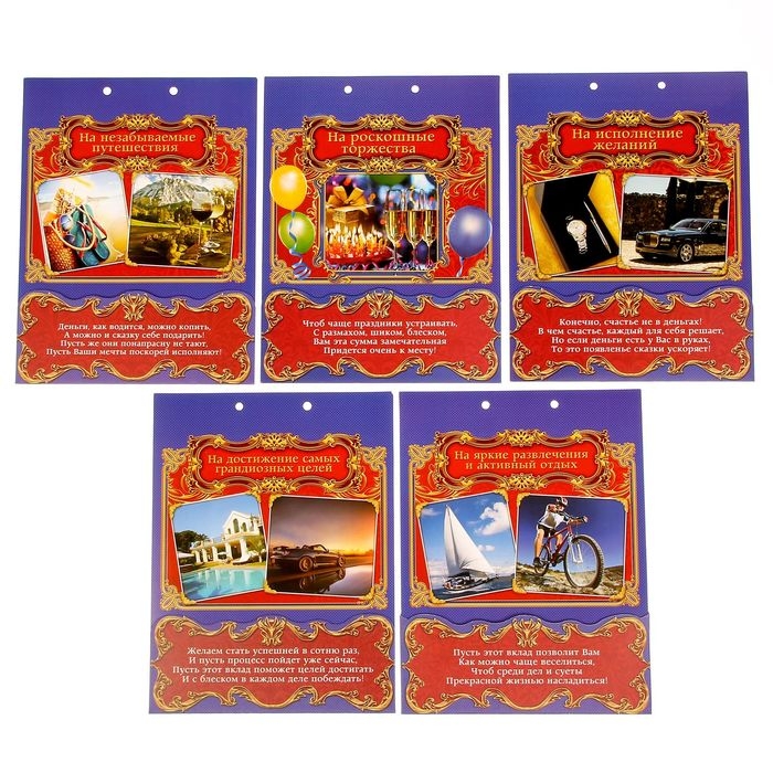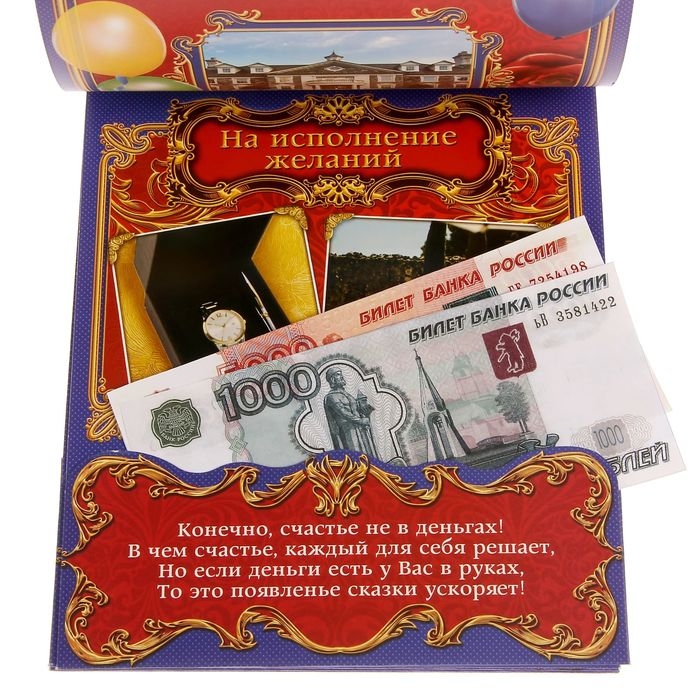 Дизайнерская открытка состоит из 5 листов, скреплённых лентой. На каждой странице с тёплыми пожеланиями располагается индивидуальный конверт. Положите внутрь банкноты — и мечты юбиляра станут явью.