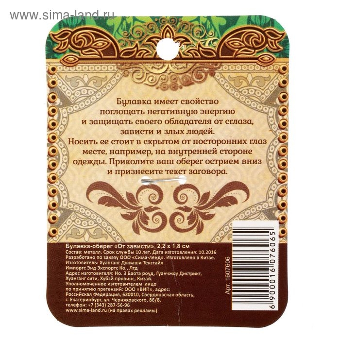 Булавка от сглаза – это простой оберег, который можно приколоть на одежду или сумку. Его целью является защита от негативной энергии, сглаза и порчи. Это древнейший талисман, который охраняет владельца, а также дарит любовь и процветание своему обладателю.