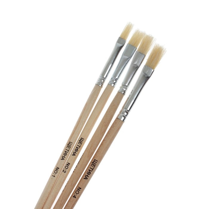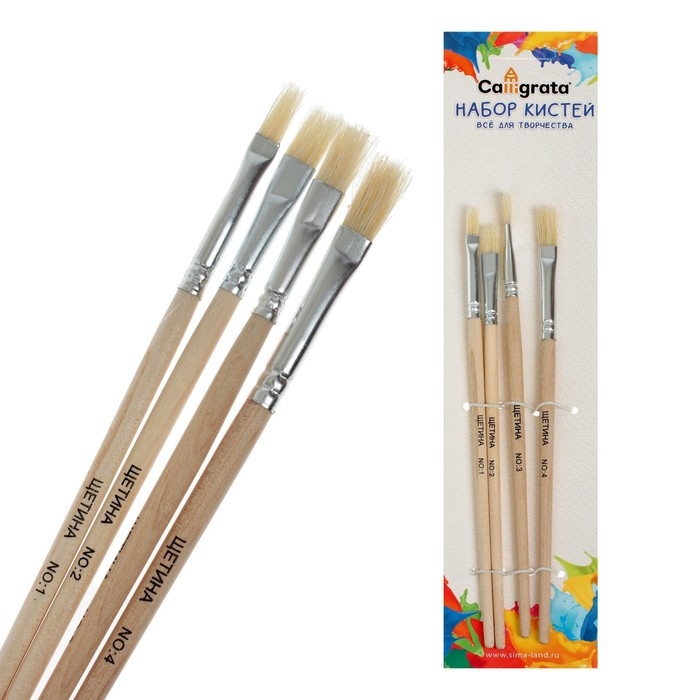 Набор кистей, щетина, плоские, 4 штуки: № 1, 2, 3, 4, с деревянными ручками, на блистере