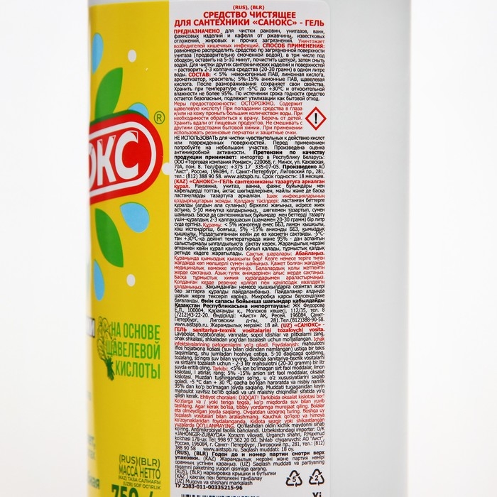 Меры предосторожности: осторожно. Содержит щелевую кислоту. При попадании в глаза или на кожу промыть большим количеством воды. При необходимости обратиться к врачу. Беречь от детей. Хранить вдали от пищевых продуктов. Не смешивать с другими средствами бытовой химии. При применении использовать резиновые перчатки. Не использовать для чистки чувствительных к действию кислот или поврежденных поверхностей. Перед применением попробуйте на небольшом участке.