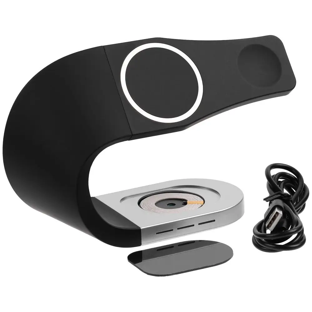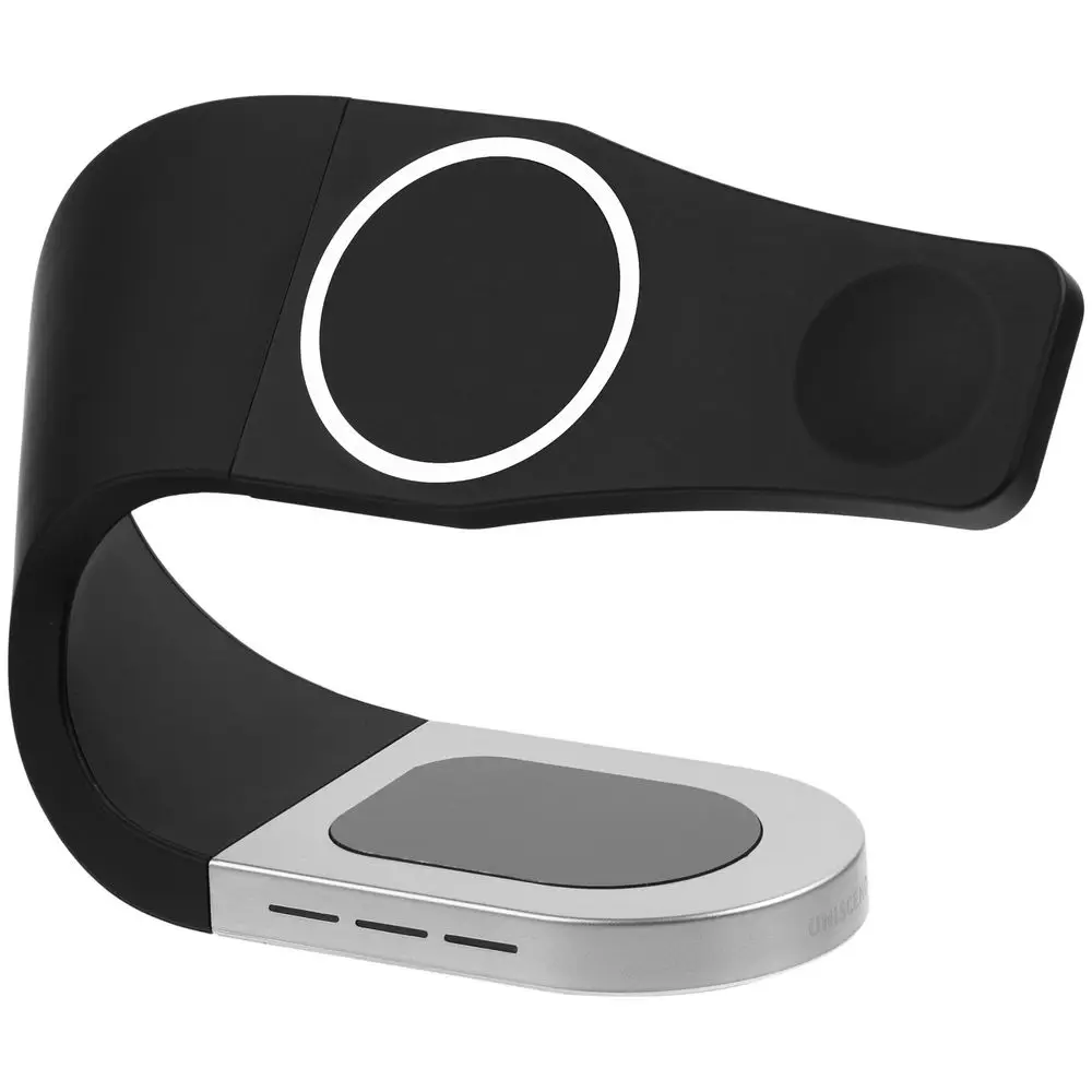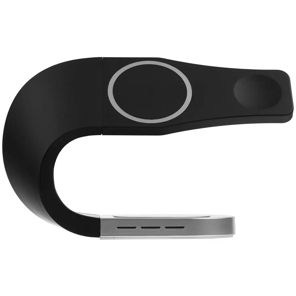 Магнитная зарядная станция может заряжать одновременно 4 устройства: беспроводные наушники Air Pods 2 (с соответствующей функцией беспроводного заряда), смартфон, часы Apple Watch (2-8) и еще одно любое устройство с помощью USB-кабеля.