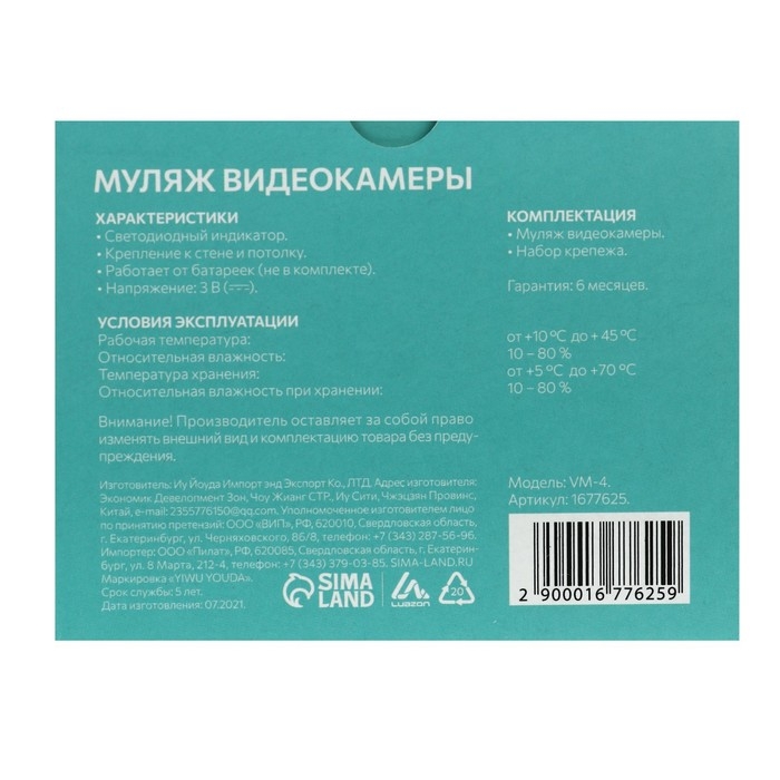 Устройство выполнено в виде купольной камеры и оснащено светодиодным индикатором, который имитирует работу настоящего прибора. Муляж работает от двух батареек и легко крепится к потолку. В комплект входят шурупы и пластмассовые дюбели для установки.
