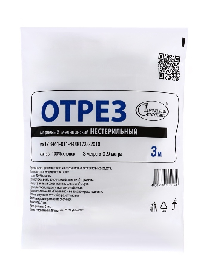 Отрез марлевый медицинский нестерильный выпускается из марли медицинской хлопчатобумажной отбеленной плотной намотки в рулоне. Благодаря новой технологии производства марлевый отрез соответствуют европейским стандартам.