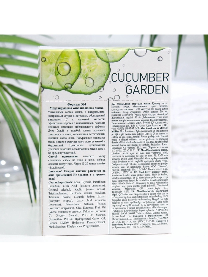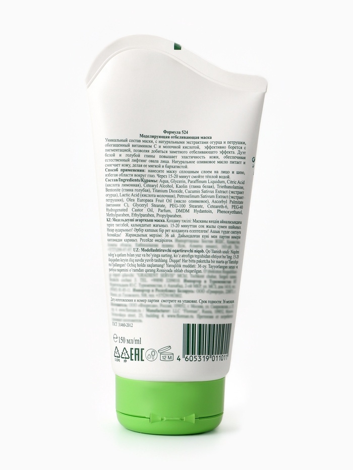 Уникальный состав маски, с натуральными экстрактами огурца и петрушки, обогащенный витамином С и молочной кислотой, эффективно борется с пигментацией, позволяя добиться заметного отбеливающего эффекта. Экстракт золотого корня омолаживает и тонизирует кожу. Дуэт белой и голубой глины повышает эластичность кожи, обеспечивая естественный лифтинг овала лица. Натуральное оливковое масло питает и смягчает кожу, делая ее мягкой и бархатистой. Практичная дозированная упаковка позволяет использование маски дома и во время путешествий.