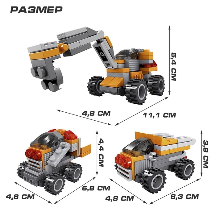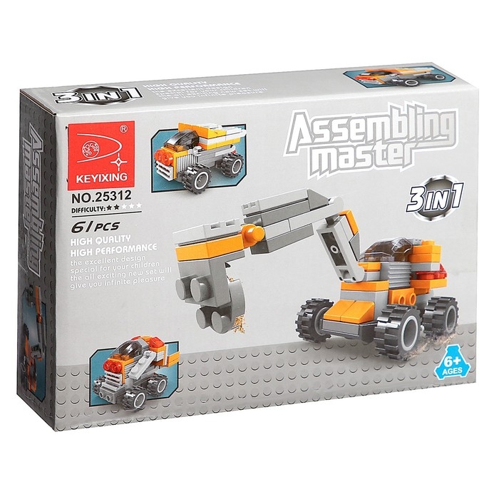 Набор содержит 61 деталь и позволяет сконструировать один из трёх вариантов спецтехники. Подвижные детали, разнообразные элементы пробудят воображение ребёнка, мальчишка придумает множество ярких сюжетов с оригинальными машинами.