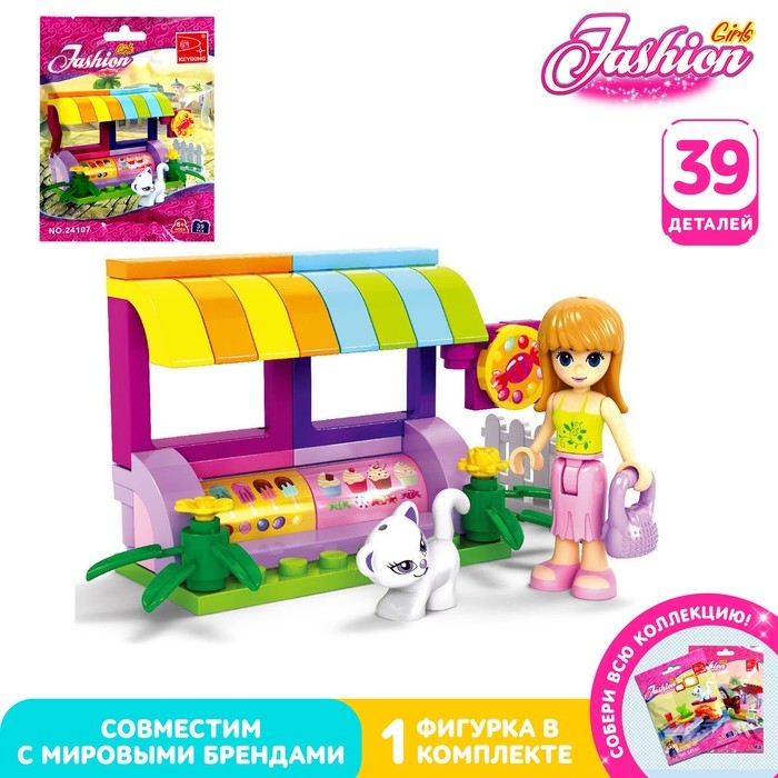 Набор содержит 39 деталей и позволяет сконструировать прилавок с рекламной вывеской, котёнка, аксессуары и фигурку девочки.