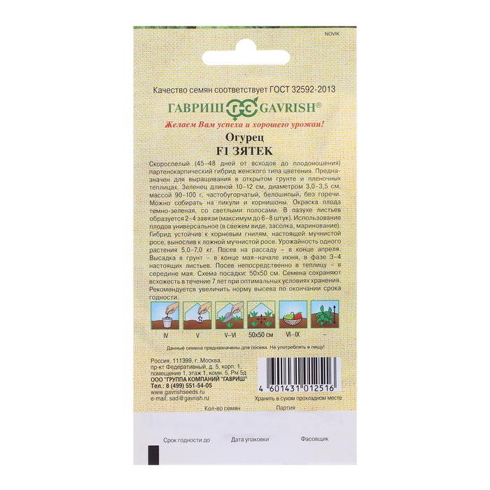 «F1 Зятёк» — это скороспелый партенокарпический гибрид женского типа цветения, у которого период от всходов до плодоношения составляет 45–48 дней. Устойчив к корневым гнилям, настоящей и ложной мучнистой росе. Предназначен для культивирования в открытом грунте и плёночных теплицах.
