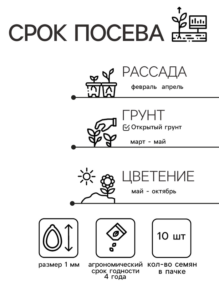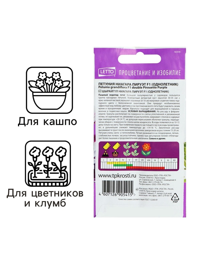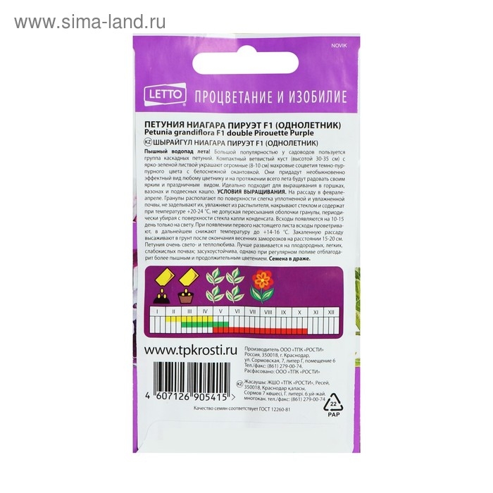 Особенности выращивания: на рассаду февраль-апрель. Гранулы располагают по поверхности слегка уплотненной и увлажненной почвы, не заделывая их, увлажняют из распылителя, накрывают стеклом и содержат при температуре 20-24°С, не допуская пересыхания оболочки гранулы периодически убирая с поверхности стекла капли конденсата. Всходы появляются на 10-15 день только на свету. При появлении первого настоящего листа всходы проветривают и в дальнейшем снижают температуру до 14-16°С. Закаленную рассаду высаживают в грунт после окончания весенних заморозков на расстоянии 15-20 см. Петуния очень светолюбива и теплолюбива. Лучше развивается на плодородных, легких, слабокислых почвах, засухоустойчива, однако при регулярном поливе отблагодарит более пышным и продолжительным цветением.