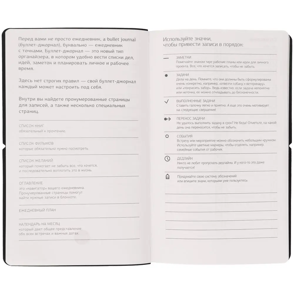 Bullet journal (буллет-джорнал, буквально — ежедневник с точками) — это новый тип органайзера, в котором удобно вести списки дел, идей, заметок и планировать личное и рабочее время. Здесь нет строгих правил — свой буллет-джорнал каждый может настроить под себя.