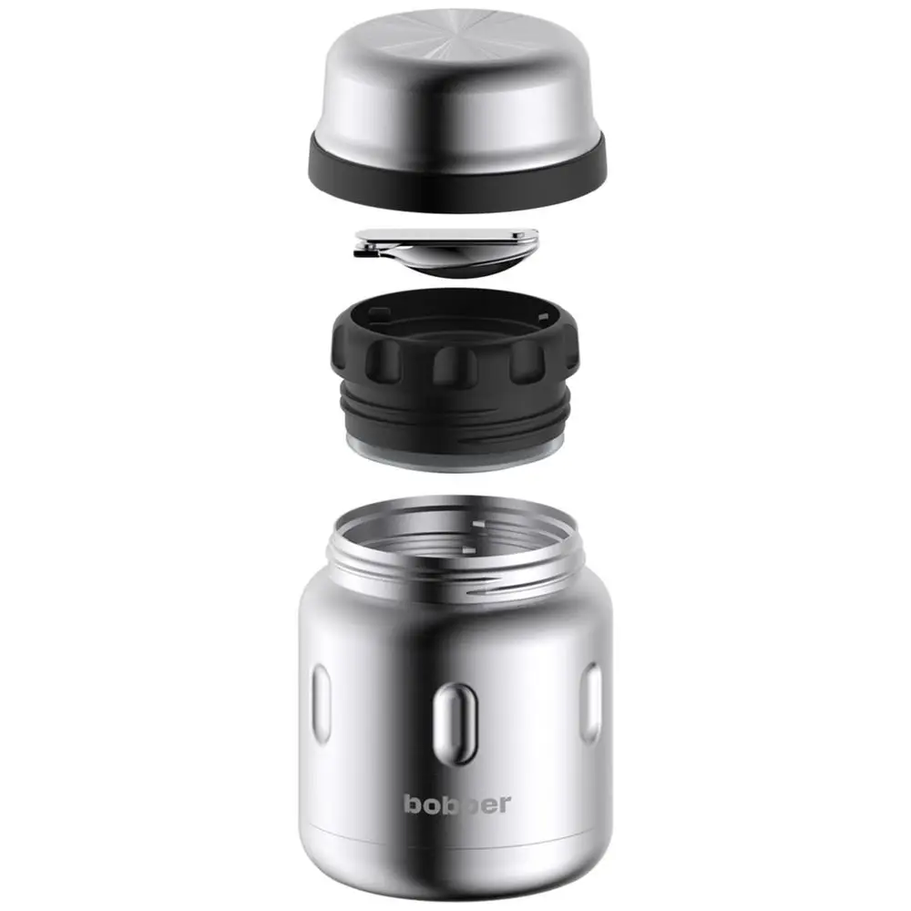 Стальной вакуумный термос для еды со складной ложкой. В нем любимые блюда не соприкасаются с пластиком и остаются горячими надолго.