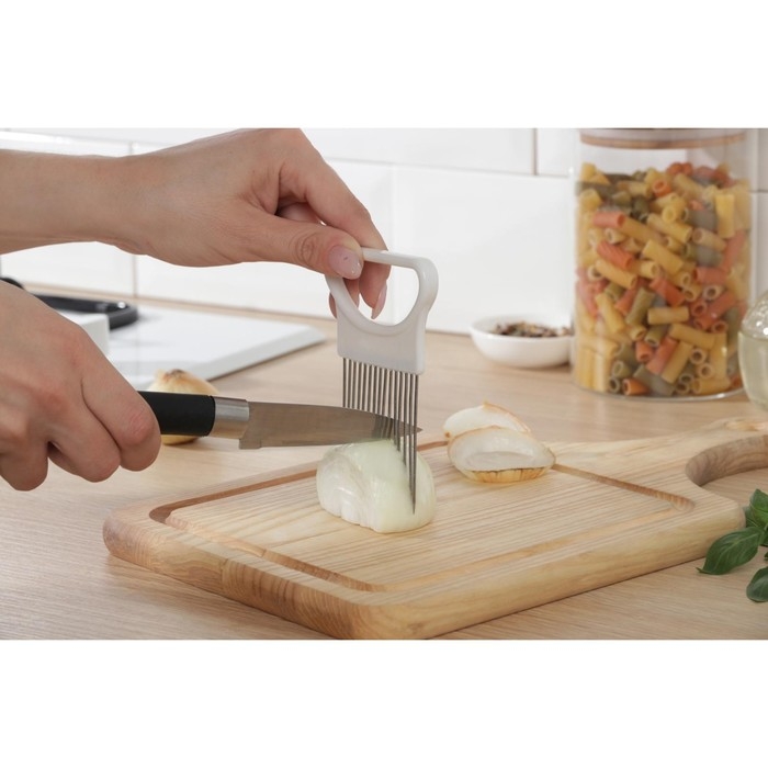 Держатель для нарезки лука — незаменимый помощник на кухне каждой хозяйки. Очищенный лук наколите на держатель и разделите на кусочки. С этим приспособлением вы нарежете весь плод до последнего кусочка и не повредите руки.