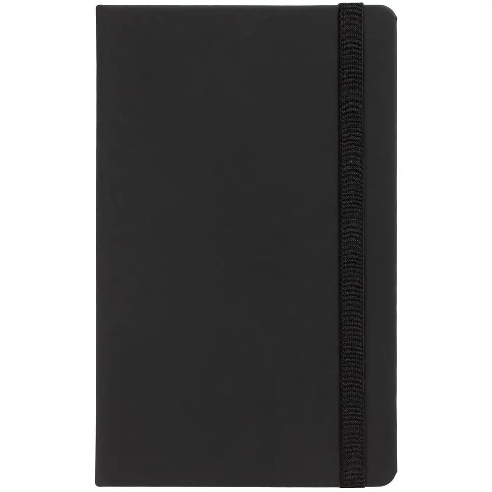 Блокнот в твердой обложке, выполнен из материала Soft Touch, черный АА, дополнен резинкой и ляссе в цвет обложки.